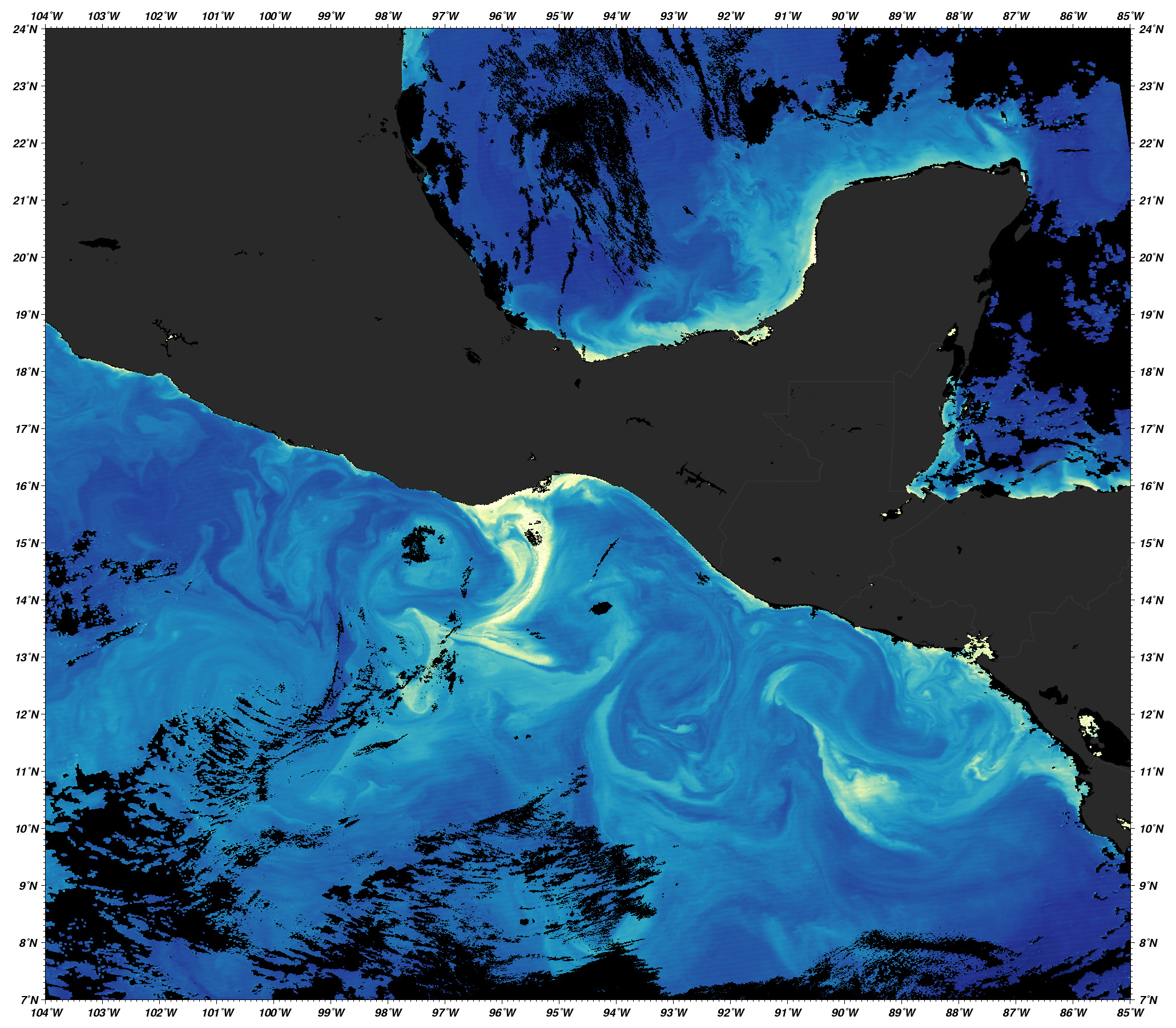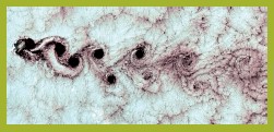 Estructuras de mesoescala (ciclones, tiempo oceánico) y submesoescala (remolinos, frentes, surgencias, etc).