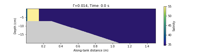 La frecuencia de oscilación1 del elemento de fluido está dada por: \[N^2=\frac{g}{\rho_0}\frac{\partial{\rho}}{\partial z}\]