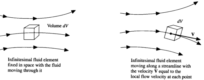 El “observador” ahora es el mismo flujo, que se mueve con la misma velocidad que el fluido, \(\vec{u}\). La tasa de cambio es simplemente la tasa de cambio de la propiedad \(P\) del propio elemento de fluido: